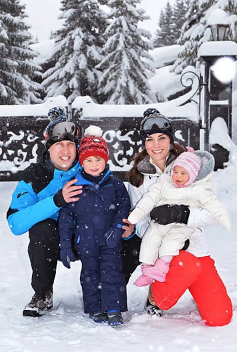 The Prince and Princess of Wales posed for this sweet snap with two of their children, George and Charlotte, on a ski trip to the French Alps. Doesn’t Charlotte look the sweetest all wrapped up in her snowsuit?
