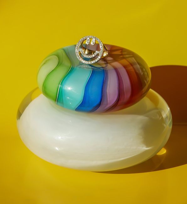 Together the designers have taken Vanderohe Curio’s iconic ‘Pebble Stack’ design and incorporated Roxanne First’s high-octane, colourful aesthetic to create the ‘Over The Rainbow Pebble Stack’ – the perfect place to display and keep your precious accessories safe.
