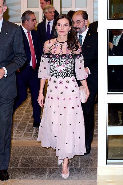 The stunning piece featured airy sleeves and a transparent mesh section at the shoulders, embroidered with botanical motifs, which allowed Queen Letizia to show a glimpse of skin.