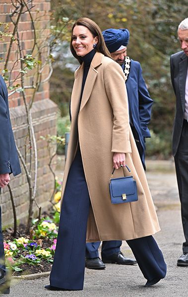 The 41-year-old wore a pair of sculptural flares and a fitted roll-neck top in a regal navy hue. Layering to perfection, Kate added a longline camel coat from Max&Co to complete her winter-ready ensemble.