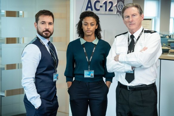 Shalom Brune-Franklin with Martin Compston (left) and Adrian Dunbar in Line of Duty.