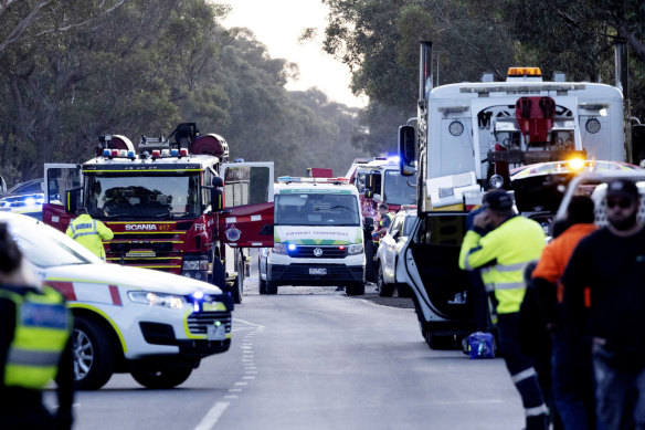 Police believe the bus left Exford Primary School – just south of Melton – about 3.30pm and was attempting to turn right onto Murphys Road from Exford Road when a truck crashed into the back of it, rolling the vehicle on its side.