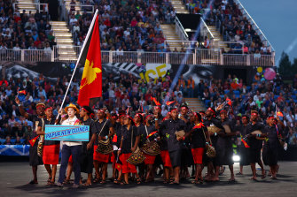 John Ume and Rellie Kaputin, flag bearers for Papua New Guinea lead their team at the Birmingham 2022 Commonwealth Games opening ceremony on Friday. The country’s three-week election started on July 4 and has not yet concluded.Credit:Getty Images